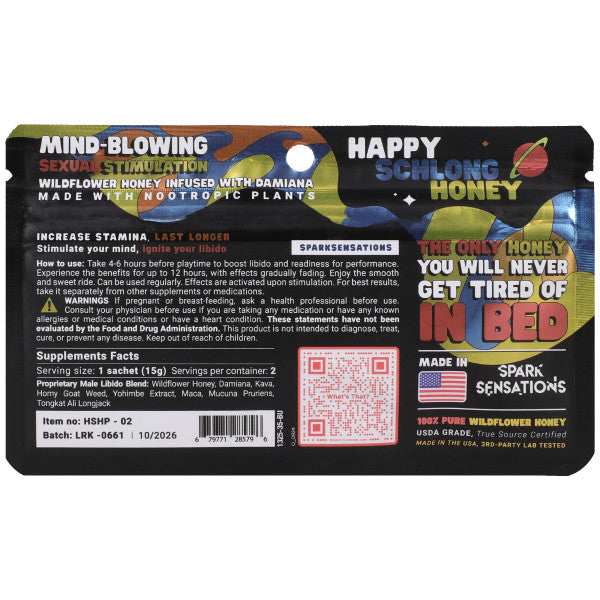 Happy Schlong Honeys is the world’s first all-natural arousal honey. It's strawberry-flavored wildflower honey, infused with nootropic...